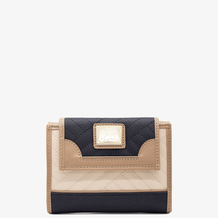 Esta carteira na divisão traseira tem uma pala com mola que dá acesso a três compartimentos, dois livres e um com fecho de correr para moedas. Na frente tem uma pala com mola que permite aceder a várias divisões, entre elas duas para notas, quatro com micas e duas com a capacidade total de doze cartões de crédito.