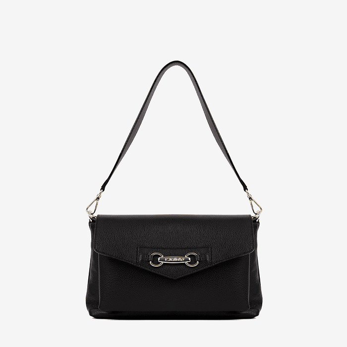 Mala de ombro, com alça de tiracolo extra ajustável (ambas removíveis). Fecho de mola, compartimento intermédio livre e compartimento principal com fecho de correr personalizado. Bolso interior com fecho de correr e um livre.