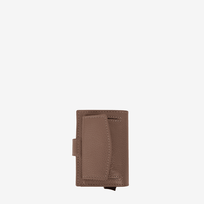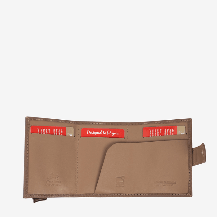 Porta cartões com capacidade onze cartões, oito com função slide e três no exterior. Um compartimento para notas e um para moedas.